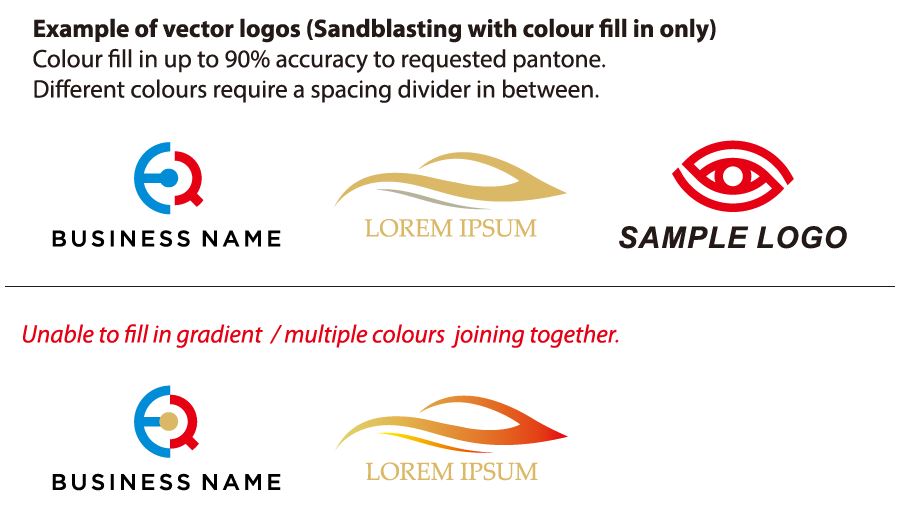 For sandblast engraving with colour fill in trophy plaques, accurate colour reproduction is important. If your company uses specific branding colours, please provide the Pantone colour codes. We will match as closely as possible with our available paints suited for fill in. These paints are designed for long lasting appearance and suited for engraving fill in. Colour fill in up to 90% accuracy of intended pantone colour. Different colours require a spacing divider in between.